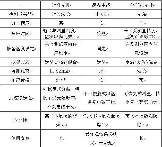 光纖光柵、感溫電纜、分布式光纖3種隧道火災溫度類火災探測技術對比如下: